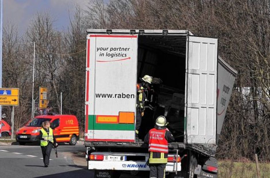 Die Feuerwehren aus Bensheim und dem Ortsteil Auerbach konnten schnell Entwarnung geben: Die Ladung blieb unbeschädigt. Um ein Umkippen und Auslaufen der Fracht zu verhindern, wurde das Gespann mit einem Kran aufgerichtet und stabilisiert. Für die Dauer von etwa drei Stunden musste der Berliner Ring zwischen der Einmündung Rodauer Straße (Zwingenberg) und Brückweg (Auerbach) voll gesperrt werden. Am Lastwagen und einem Verkehrsschild entstand ein Schaden von etwa 600 Euro. /Bild: Matern ots