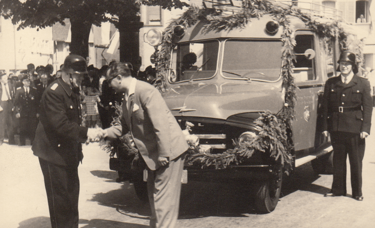 Die neue Feuerwache in der Rodensteinstraße wird eingeweiht. Zu diesem Anlass wurde die neue Kraftfahrdrehleiter DL 17 von Bürgermeister Treffert übergeben.
