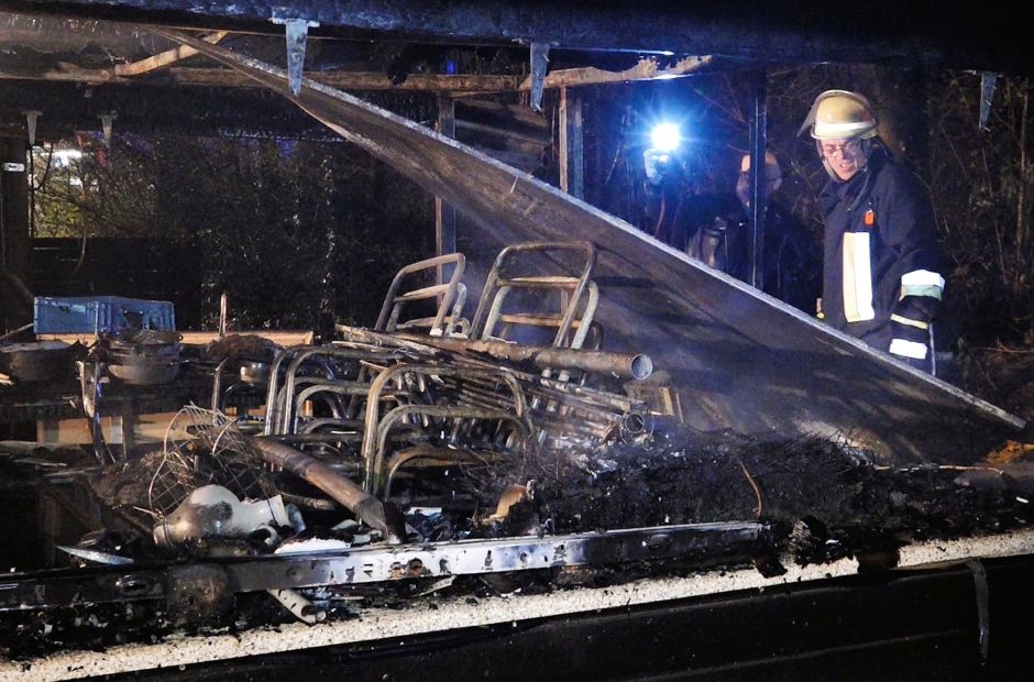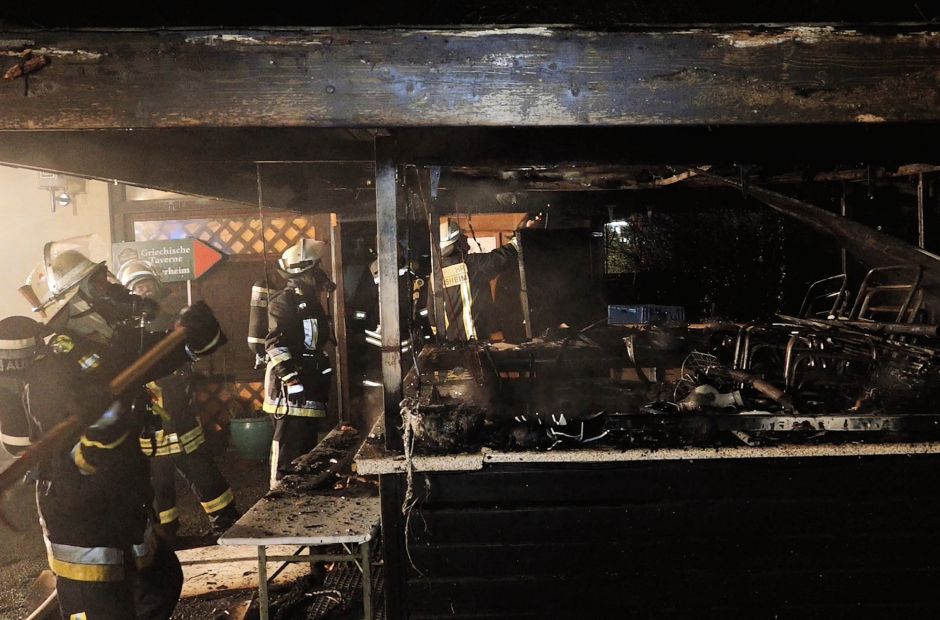 BENSHEIM. Feuer: In der Nacht zum Sonntag ist gegen 1.30 Uhr ein Holzpavillon in der Schwanheimer Straße vollständig abgebrannt. Verletzte gab es nicht. Durch das schnelle Eingreifen der Bensheimer Feuerwehr konnte ein Übergreifen der Flammen auf eine angrenzende Gaststätte noch verhindert werden. Der Pavillon diente als Lagerraum für die Gaststätte. Der Schaden wird auf mehrere tausend Euro geschätzt. Die Brandursache ist unklar, die Kripo in Heppenheim ermittelt. red/pol