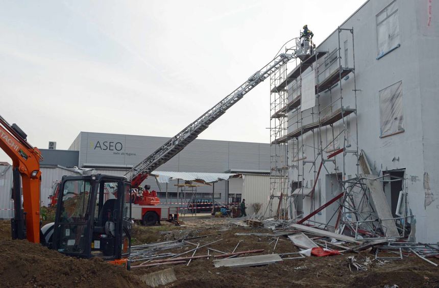 Das Baugerüst – mindestens acht Meter hoch und rund zehn Meter breit – wurde von dem rabiaten Fahrzeuglenker ebenfalls eingerissen, so dass die Stahlträger nur noch an wenigen Befestigungen hingen. Auf seinem Weg hatte der Baggerfahrer außerdem Dach und Wände eines Blechschuppens eingerissen. Den 15-Tonnen-Bagger ließ der Unbekannte anschließend stehen und verschwand vom Gelände.