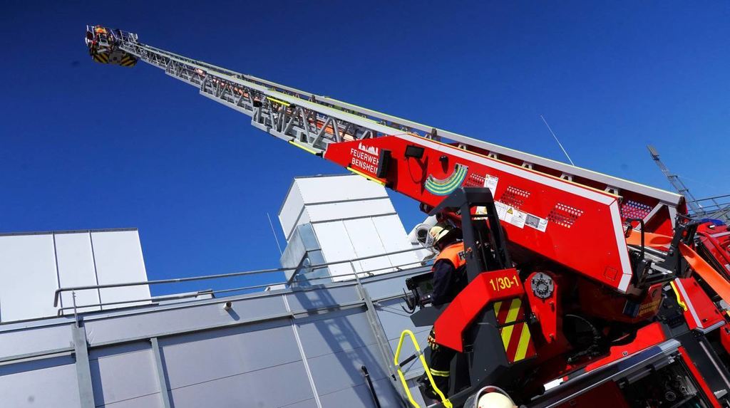 Währenddessen, gegen 10:45 Uhr, traf die neue Drehleiter der Bensheimer Feuerwehr ein, die seit Anfang des Jahres im Einsatz ist. Sie parkte zunächst im zentralen Innenhof des Areals, um sich den betroffenen Gebäuden von der anderen Seite zu nähern. Ein technisch vollgepackter Koloss mit einer Gesamtlänge inklusive Knickgelenk bei vollständig vertikaler Ausrichtung von rund 30 Metern. Der Rettungskorb bietet bis zu fünf Personen Platz, darüber hinaus ist ein automatischer Wasserwerfer installiert. Auch mehrere Kameras und ein Beleuchtungssystem gehören zur Ausstattung des Geräts, mit dem die Wehr ihren Fuhrpark erheblich modernisiert hat. Der Vorgänger stammte aus dem Jahr 1996 und war reif für einen Nachfolger.