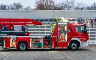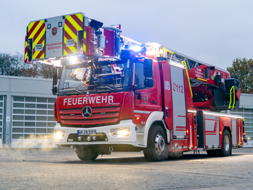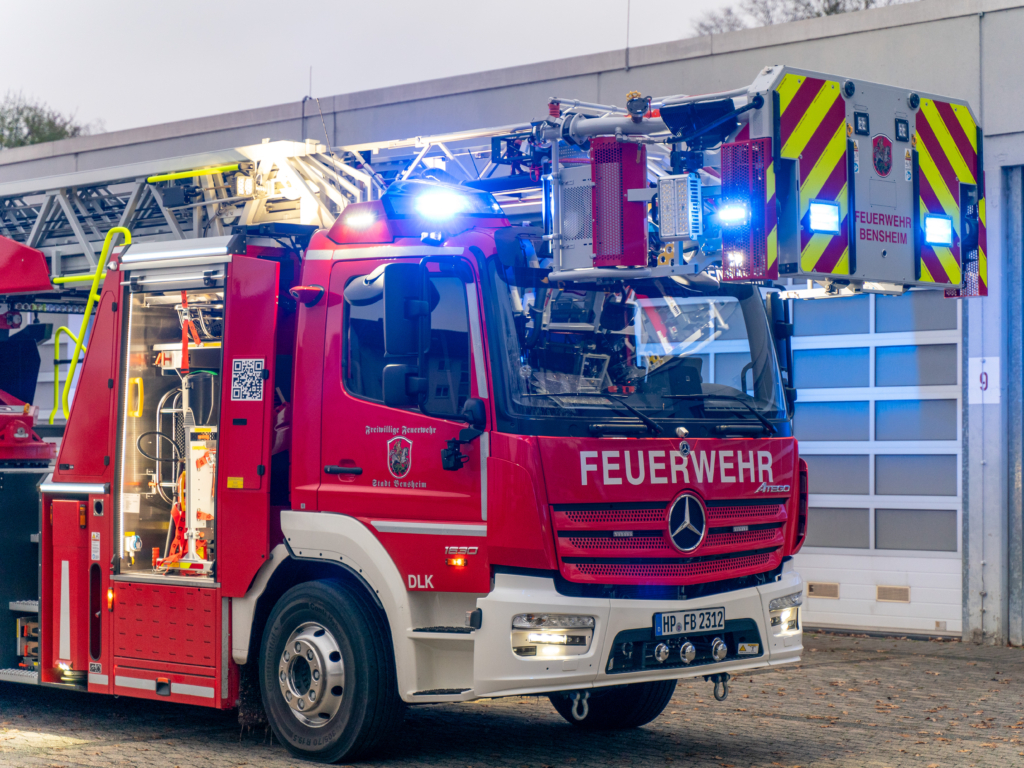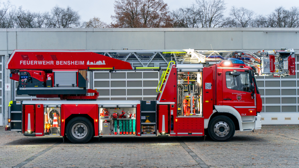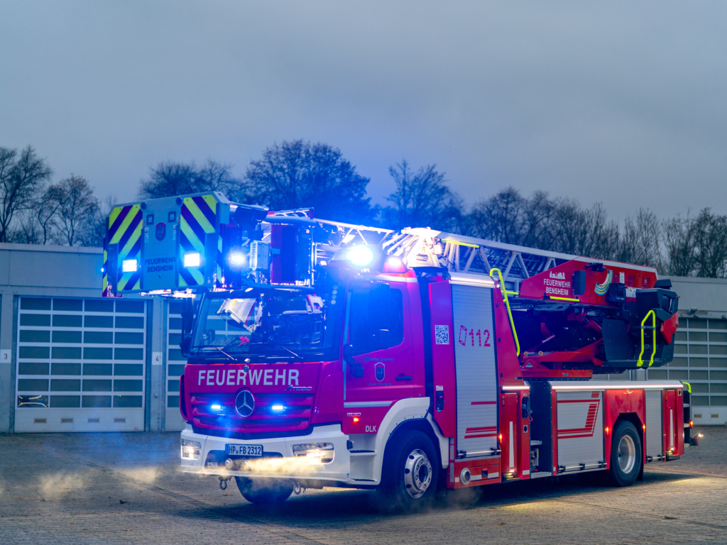 Die DL(A)K 23/12 der Feuerwehr Bensheim wurde 2023 von Rosenbauer ausgeliefert. Sie hat einen 5 Personenkorb und kann über ein Gelenk im obersten Leiterteil nochmals abgeknickt werden. Dies ist von Vorteil, um Dachfenster und tiefgelegene Stellen besser erreichen zu können. Die Drehleiter dient zur Menschenrettung und Brandbekämpfung und ist das 3. Fahrzeug im Löschzug nach ELW und LF 16/1 und fährt vor dem HLF20 raus. Oft wird die Drehleiter auch vom Rettungsdienst angefordert, wenn ein Treppenhaus zu eng ist, um einen Patienten darüber transportieren zu können. Dann wird eine der 2 Tragen, mit der dafür vorgesehenen Halterung, auf/ oder im Korb befestigt und der Patient schonend zum Boden transportiert. Im obersten Leiterteil ist außerdem eine B-Leitung fest verlegt, was bei der Brandbekämpfung über die Drehleiter, Zeit beim Verlegen der Schlauchleitung spart. Am Korb sind verschiedene Aufnahmen vorhanden. Hier können z.B. 2 verschiedene Monitore zur Wasserabgabe, Krankentragenhalterungen, Adapter für den Elektrolüfter, LED-Scheinwerfer oder die Vorrichtung für das Rollgliss befestigt werden. Am Korb sind zusätzlich noch zwei LED-Scheinwerfer befestigt. Für den Betrieb von Elektrogeräten stehen mehrere Steckdosen (230/400V) am Korb zur Verfügung, welche über den auf dem Drehkranz verlasteten Stromerzeuger, mit Strom versorgt werden. Der Stromerzeuger kann direkt vom Korbbedienstand aus, gestartet werden.