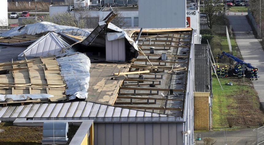 Bis in die Abendstunden waren 42 Männer und Frauen des Technischen Hilfswerks in Bensheim im Einsatz, um das Schlimmste zu verhindern. „Das Dach ist größtenteils entlang der Längsseite abgedeckt. Wir können aber niemanden hochschicken, das ist bei den aktuellen Windböen viel zu gefährlich“, erklärte Einsatzleiter Sascha Stein vor Ort. Offenbar hatte sich der Sturm unter der Konstruktion verfangen und diese aus der Verankerung gerissen. Das Gelände rund um das Berufliche Schulzentrum des Kreises am Berliner Ring wurde am Sonntag weiträumig abgesperrt.