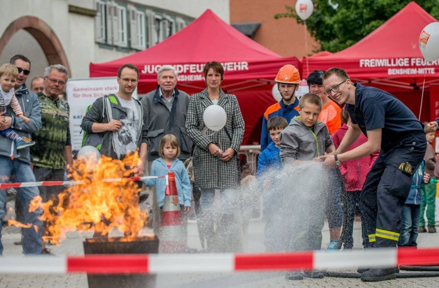 BENSHEIM. Dient beim Bensheimer Musikfestival Maiway ein roter Strich als Orientierung für die Besucher, so konnte man am Samstag einem neogelben Feuerwehrschlauch folgen, um keine Station der Bensheimer Feuerwehr zu verpassen. Die Freiwillige Feuerwehr Bensheim-Mitte veranstaltete in der Fußgängerzone den Tag der Feuerwehr.
