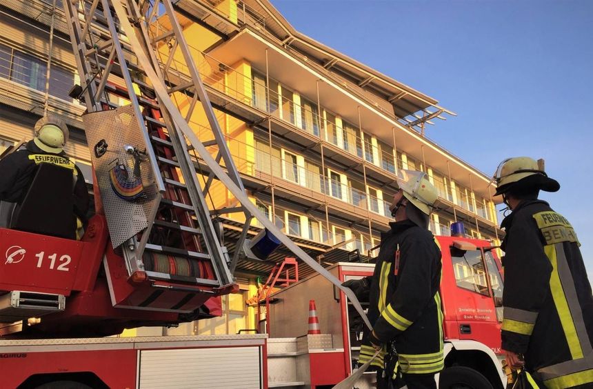 BENSHEIM. Bensheim, Wormser Straße, am ehemaligen Mercure-Hotel. Feuerwehrfahrzeuge rücken an, Einsatzkräfte steigen aus, ziehen Atemschutzflaschen und Masken auf. Die Drehleiter wird ausgefahren und in Stellung gebracht. Überall rote Autos, Blaulicht und ausgerollte Schläuche.