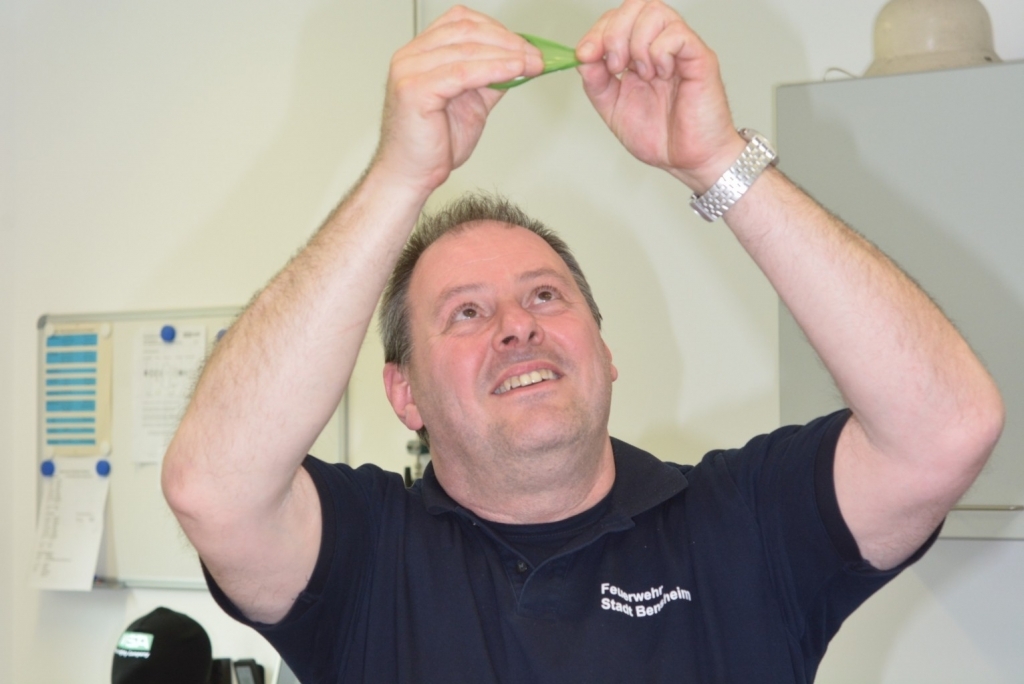 Herr Sponagel prüft, wartet und setzt die Atemschutzgeräte, die Atemschutzmasken und die Chemikalienschutzanzüge Instand. Dazu prüft und reinigt er das Schlauchmaterial.